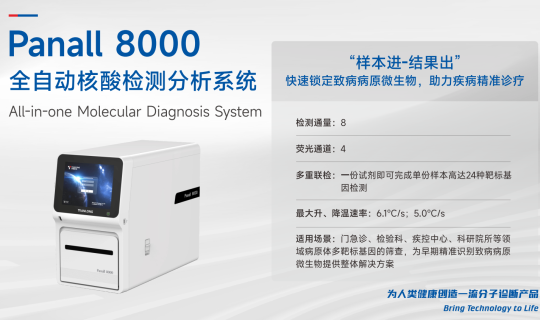 今年推出的人類ApoE、SLCO1B1基因多態性檢測試劑等就是為滿足精準醫療背景下他汀個體化用藥需求而研發,而Panall 8000全自動多重病原檢測分析系統則是適應分子診斷行業發展趨勢的又一自主創新產品,旨在實現呼吸道、消化道、血液系統感染等癥候群相關病原微生物一“管”聯檢,為門急診快速檢測提供更加集約高效的解決方案。
