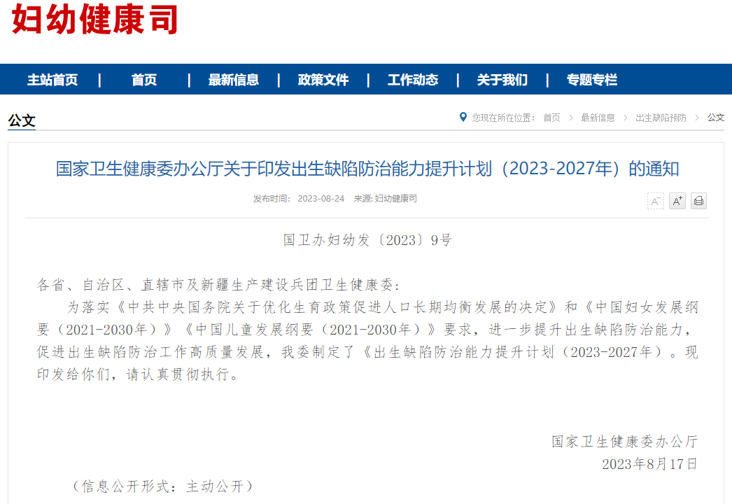 國家衛(wèi)生健康委發(fā)布《關于印發(fā)出生缺陷防治能力提升計劃(2023-2027年)的通知》(以下簡稱《計劃》),旨在進一步提升出生缺陷防治能力,促進出生缺陷防治工作高質量發(fā)展。