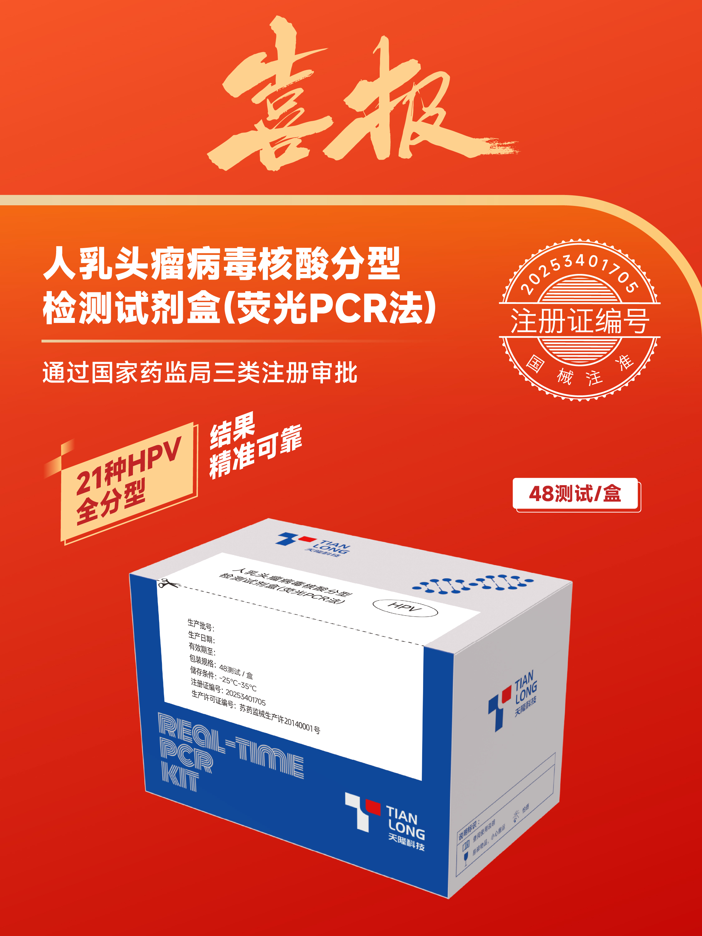 天隆HPV核酸分型檢測(cè)試劑,采用熒光PCR技術(shù),一次可實(shí)現(xiàn)21種HPV的核酸分型檢測(cè)(HPV16, 18, 26, 31, 33, 35, 39, 45, 51, 52, 53, 56, 58, 59, 66, 68, 73, 82及HPV 6, 11和81型)。