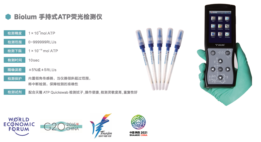 本次合作的核心產(chǎn)品Biolum手持式ATP熒光檢測(cè)儀,是天隆科技在食品安全和衛(wèi)生監(jiān)控領(lǐng)域的明星產(chǎn)品。它檢測(cè)速度快,10秒即可完成潔凈度檢測(cè),具備靈敏度高、操作簡(jiǎn)便、機(jī)身小巧便捷等突出特點(diǎn),適用于包括食藥監(jiān)抽檢、食品加工企業(yè)自檢、醫(yī)療機(jī)構(gòu)、商超現(xiàn)場(chǎng)抽檢、校園食堂巡檢、大型活動(dòng)用餐安全保障等的多場(chǎng)景檢測(cè)。該產(chǎn)品在國(guó)內(nèi)衛(wèi)生監(jiān)督系統(tǒng)及食品企業(yè)得到廣泛應(yīng)用,也曾多次為G20峰會(huì)、達(dá)沃斯論壇、全運(yùn)會(huì)等重大國(guó)際活動(dòng)提供食品安全保障。