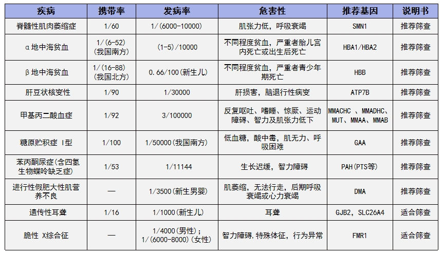 根據核心推薦意見3,共識列出了國內幾種常見的推薦及適合納入攜帶者篩查的疾病。其中“推薦篩查”為該疾病建議納入篩查,“適合篩查”為該疾病可考慮選擇納入篩查。